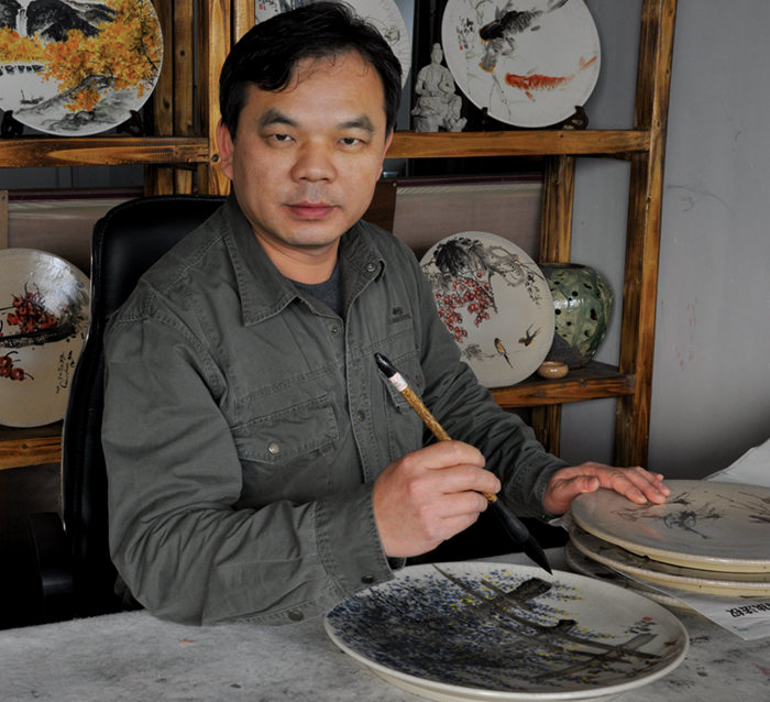 He ardently loves painting and calligraphy from his childhood. He is good at drawing flowers, birds, insects and fish, and landscape freehand brushwork in traditional Chinese painting. He is intelligent in art and sensitive in touch, and has a strong design and creation awareness and ability. He combines the skillful outstanding traditional culture and the technology of the ceramic production process, forming changeable “vulgar and elegant” ceramic painting features with his own unique characteristics which combine mud, color, fire, and painting burning. In 2007, he established Meitao Art Studio. His works rely mainly on ceramic hanging plates, ceramic plate painting, sculpture and so on, which find a good sale in domestic and foreign markets.